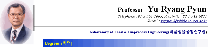 1977 ~ Present : Professor, Department of Biotechnology, Yonsei University, Korea 1994 ~ Present : The Director. Bioproducts Research Center 1997 ~ Present : A Member of Advisory Committee, Ministry of Science & Technology 1995 ~ Present : A Member of Appraiser, KNITQ 1997 ~ Present : A Member of Appraiser, Ministry of Education 1996 ~ Present : A member of Judging Committee, The Office of National Tax Adminstration 1996 ~ Present : A Member of Advisory Committee, Ministry of Tradition & Industry
