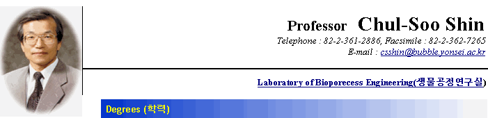 H.S.Kim, J.Y.Ju, J.H.Suh and C.S.Shin, Optimized fed-batch fermentation of L-¥â-hydroxy isobutyric acid by Yarrowia lipolytica, Bioprocess Engineering, 20(3), 189-193, (1999) J.Y.Ju, D.Y.Kim, J.H.Suh and C.S.Shin, Optimization of monascus red pigment fermentation by regulating chitinase activity level in fermentor, Bioprocess Engineering, in press(June), (1999) Jae Yeong Ju, Chul Soo Shin, Michael J. Whitcombe and Evgeny N. Vulfson, Imprinted polymers as tools for the recovery of secondary metabolites produced by fermentation, Biotechnology & Bioengineering, accepted(Decem.22, 1998), (1999) Hyun Jung Kim, Jong Hyun Kim, Jae Gu Pan and Chul Soo Shin, Conversion of D-sorbitol to L-sorbose by Gluconobacter suboxydans cells immobilised with oxygen-carriers in alginate beads, Process Biochemistry, accepted(April 22, 1999), (1999) Chul S. Shin, Hyung J. Kim, Moon J. Kim and Jae Y. Ju, Morphological change and enhanced pigment production of Monascus when cocultured with Saccharomyces cerevisiae or Aspergillus oryzae, Biotechnology & Bioengineering, 59(5), 576-581,(1998) Dae Ho Kim, Jung Hae Suh, Jae Yeong Ju, Sung Kwan Yum and Chul Soo Shin, Analysis of sisomicin binding sites in Micromonospora inyoensis cell wall, FEMS Microbiology Letters, 166, 9-13, (1998) Ok Hee Ryu, Jae Yeong Ju and Chul Soo Shin, Continuous L-cysteine production using immobilized cell reactors and product extractors, Process Biochemistry, 32(3), 201-209, (1997) Nam,K.H., Ryu,O.H., Park,J. and Shin,C.S., Effects of anoxic condition on the enzymatic conversion of D,L-2-amino-thiazoline-4-carboxylic acid to L-cysteine, Acta Biotechnologica, 17(2), 185-193, (1997) Chul Soo Shin, Ji Yeon Song, Ok Hee Ryu, Shaw S. Wang, Enhancing Effect of Albumin Hydrolysate on Ethanol Production Employing Saccharomyces sake, Biotechnol. Bioeng. Vol.45, (1995) Ok Hee Ryu, Sea Wha Oh, Seung Ku Yoo, and Chul Soo Shin, The Stability of L-ATC Hydrolase Participating in L-Cysteine Production, Biotechnol.Lett., 17(3), 275-280, (1995) Chul Soo Shin, Seong Yong Kim and Jae Young Ju, Characteristics of sisomicin fermentation supplemented with MgSO4 in stirred and air lift fermentors, Biotechnol. Lett., 16(3), 251-256, (1994) Ok Hee Ryu, Ju Hyun Yu & Chul Soo Shin, The Role of Hydroxylamine in the Conversion of S-Carbamyl-L-cysteine to L-Cysteine, Biosci. Biotechnol.Biochem., 57(5),829-830, (1993) Ki Moon Pae, Ok Hee Ryu, Hyun Sook Yoon & Chul Soo Shin, Kinetic Properties of L-Cysteine Desulfhydrase-deficient Mutant in the Enzymatic Formation of L-Cysteine from D,L-ATC : Biotechnol. Lett., 14(12),1143-1148, (1992)