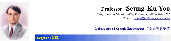 1996 - Present: Associate Professor, Dept. of Biotechnology, Yonsei University, Korea. 1993 - 1996: Assistant Professor, Dept. of Biotechnology, Yonsei University, Korea. 1991 - 1993: Post Doctoral Fellow, Brown University, Providence, Rhode Island, U.S.A. 1986 - 1990: Research Assistant University of Arizona, Tucson, Arizona, U.S.A.