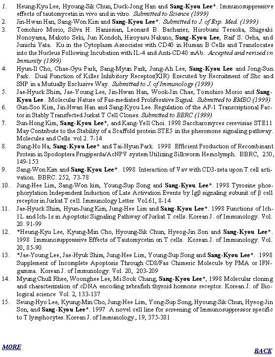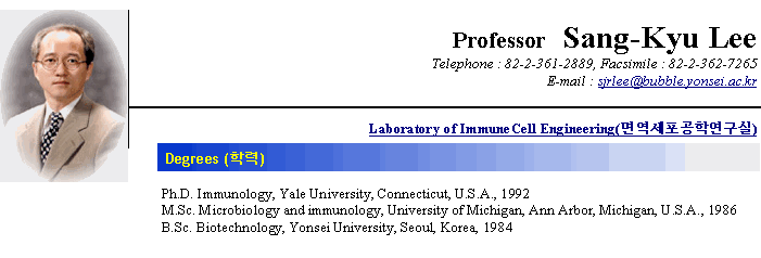 1998 - Present : Associate Professor. Department of Biotechnology, Yonsei University, Korea. 1995 - 1998 : Assistant Professor. Department of Biotechnology, Yonsei University, Korea. 1993 - 1995 : Lecturer and Research Associate, Havard Medical school, Massachusetts, U.S.A. 1992 - 1993 : Postdoctoral fellow, Havard Medical school, Massachusetts, U.S.A.