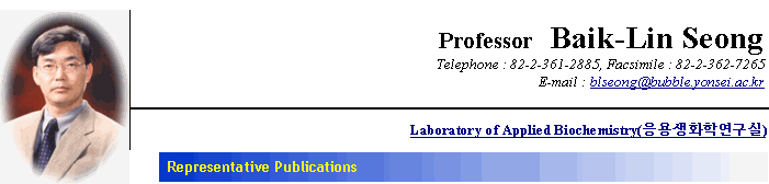 Y.S. Lee and B.L. Seong (1996) Mutational analysis of influenza B virus RNA transcription in vitro. J.Virol. 70, 1232. B.L. Seong and K.H. Lee (1996) Position 4 nucleotide at the 3' end of influenza A virion RNA as a cis-acting signal for segment-specific regulation of RNA synthesis. Options for the control of influenza III. Elsevier Science. 1996. p410-413. B.L. Seong and Y.S. Lee (1996) Specificity between the influenza A and B viruses: the role of panhandle region of the influenza virion RNA. Options for the control of influenza III. Elsevier Science. 1996. p414-418. D.C. Pritlove, E. Fodor, B.L. Seong and G.G. Brownlee (1995) In vitro transciption and polymerase binding studies of the termini of influenza A viurs cRNA: evidence for a cRNA panhandle. J.Gen.Virol. 76, 2205. B.L. Seong (1993) Influencing the influenza virus: Genetic analysis and engineering of the negative-sense RNA genome. Inf. Agents Dis. 2, 17. E. Fodor, B.L. Seong and G.G. Brownlee (1993) Photochemical crosslinking of influenza A polymerase to its virion RNA promoter defines a polymerase binding site at residues 9 to 12 of the promoter. J.Gen.Virol. 74, 1327 B.L. Seong and G.G. Brownlee (1992) Nucleotides 9 to 11 of the influenza A virion RNA promoter are crucial for activity in vitro. J.Gen.Virol. 73, 3115 B.L. Seong and G.G. Brownlee (1992) A new method for reconstituting influenza polymerase and RNA in vitro: A study of promoter elements for cRNA and vRNA synthesis in vitro and viral rescue in vivo. Virol. 186, 247 B.L. Seong, M. Kobayashi, K. Nagata, G.G. Brownlee and A. Ishihama (1992) Comparison of two reconstitution system for in vitro transcription and replication of influenza virus. J. Biochem. 111, 496 M.R. Dyson, C.P. Lee, N. Mandal, B.L. Seong, U. Varshney and U.L. RajBhandary(1993) Identity of a prokaryotic initiator tRNA: The Translational Apparatus. Nierhaus et al eds. Plenum Press, New York p23 C.P. Lee, B.L. Seong and U.L. RajBhandary (1991) Structural and sequence elements important for recognition of E.coli formylmethionine tRNA by methionyl-tRNA transformylase are clustered in the acceptor stem. J.Biol.Chem. 226, 18012 U. Varshney, C.P. Lee, B.L. Seong and U.L. RajBhandary (1991) Mutants of initiator tRNA that function both as initiators and elongators. J.Biol.Chem. 266, 18018 B.L. Seong, C.P. Lee and U.L. RajBhandary (1991) Suppression of amber codons in vivo as evidence that mutants derived from E.coli initiator tRNA can act at the step of elongation of protein synthesis. J.Biol.Chem. 246, 6504 B.L. Seong and U.L. RajBhandary (1987) E.coli formylmethionine tRNA: Mutations in GGG/CCC sequence conserved in anticodon stem of initiator tRNAs affect initiation of protein synthesis and conformation of anticodon loop. Proc.Natl.Acad.Sci.USA 84, 334 B.L. Seong and U.L. RajBhandary (1987) Mutants of E.coli formylmethionine tRNA: a single base change enables initiator tRNA to act as an elongator in vitro. Proc.Natl.Acad.Sci.USA 84, 8859 B.L. Seong, H.J. Son, T.I. Mheen, Y.H. Park and M.H. Han (1985) Enzymatic oxidation of rifamycins by a microorganism of the genus Humicola. J.Ferment.Technol. 63, 515 M.H. Han, B.L. Seong, H.J. Son and T.I. Mheen (1983) Rifamycin B oxidase from Monocillium species: a new type of diphenol oxidase. FEBS Lett. 151, 36 B.L. Seong, H.J. Son, T.I. Mheen and M.H. Han (1983) Microbial transformation of rifamycin B: a new synthetic approach to rifamycin derivatives. J.Antibiotics 36, 1402 B.L. Seong and M.H. Han (1982) A facile preparation of rifamycin derivatives by use of manganese dioxide. Chem.Lett. 5, 627 J.M. Park, C.Y. Choi, B.L. Seong and M.H. Han (1982) Effect of external mass transfer in a recirculation batch reactor system for immobilized penicillin amidase. Biotechnol.Bioeng. 24, 2215 J.M. Park, C.Y. Choi, B.L. Seong and M.H. Han (1982) Production of 6-aminopenicillanic acid by a multi-stage tubular reactor packed with immobilized penicillin amidase. Biotechnol.Bioeng. 24, 1623 H.J. Son, T.I. Mheen, B.L. Seong and M.H. Han (1982) Studies on microbial penicillin amidase (4). Production of penicillin amidase for a partially constitutive mutant of Bacillus megaterium. J.Gen.Appl.Microbiol. 28, 281 B.L. Seong, M.H. Han, J.M. Park and C.Y. Choi (1981) A graphical method of determining external diffusion free Michaelis-Menten constant for immobilized enzyme in a packed bed reactor. Biotechnol. Lett. 3,607